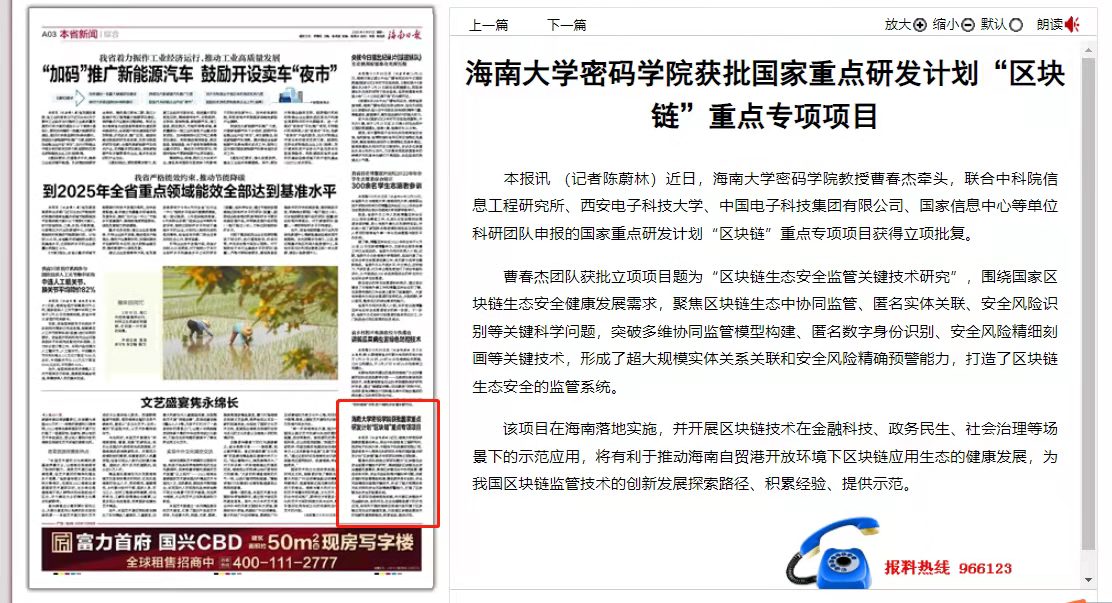曹春杰团队获批立项项目题为“区块链生态安全监管关键技术研究”,围绕国家区块链生态安全健康发展需求,聚焦区块链生态中协同监管、匿名实体关联、安全风险识别等关键科学问题,突破多维协同监管模型构建、匿名数字身份识别、安全风险精细刻画等关键技术,形成了超大规模实体关系关联和安全风险精确预警能力,打造了区块链生态安全的监管系统。