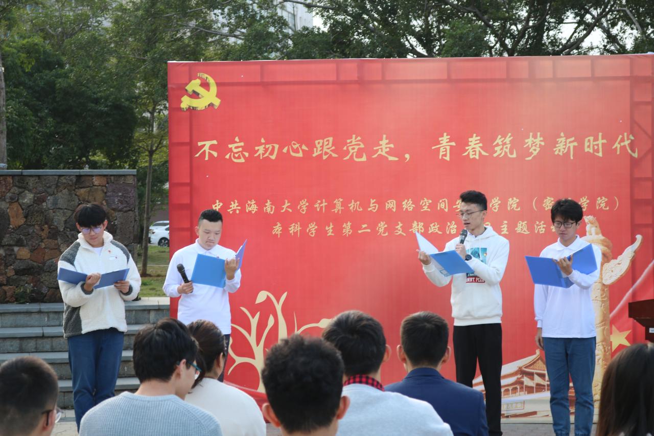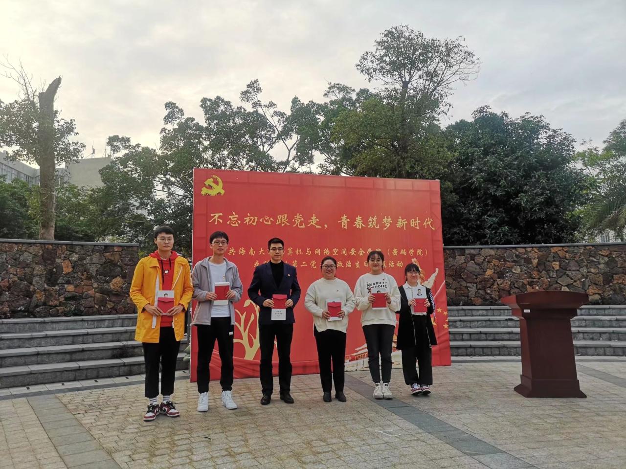 为充分发挥党组织的战斗堡垒作用和党员的先锋模范作用,强化党员宗旨意识,抒发党员爱党爱国情怀,2020年12月18日,计算机与beat365在线唯一官网(密码学院)本科学生第二党支部于青春记忆广场开展“不忘初心跟党走,青春筑梦新时代”政治生日主题活动。党支部书记黄苗苗、教师党员万隽、支部党员及入党积极分子代表参加本次活动。黄春早同志主持本次活动。