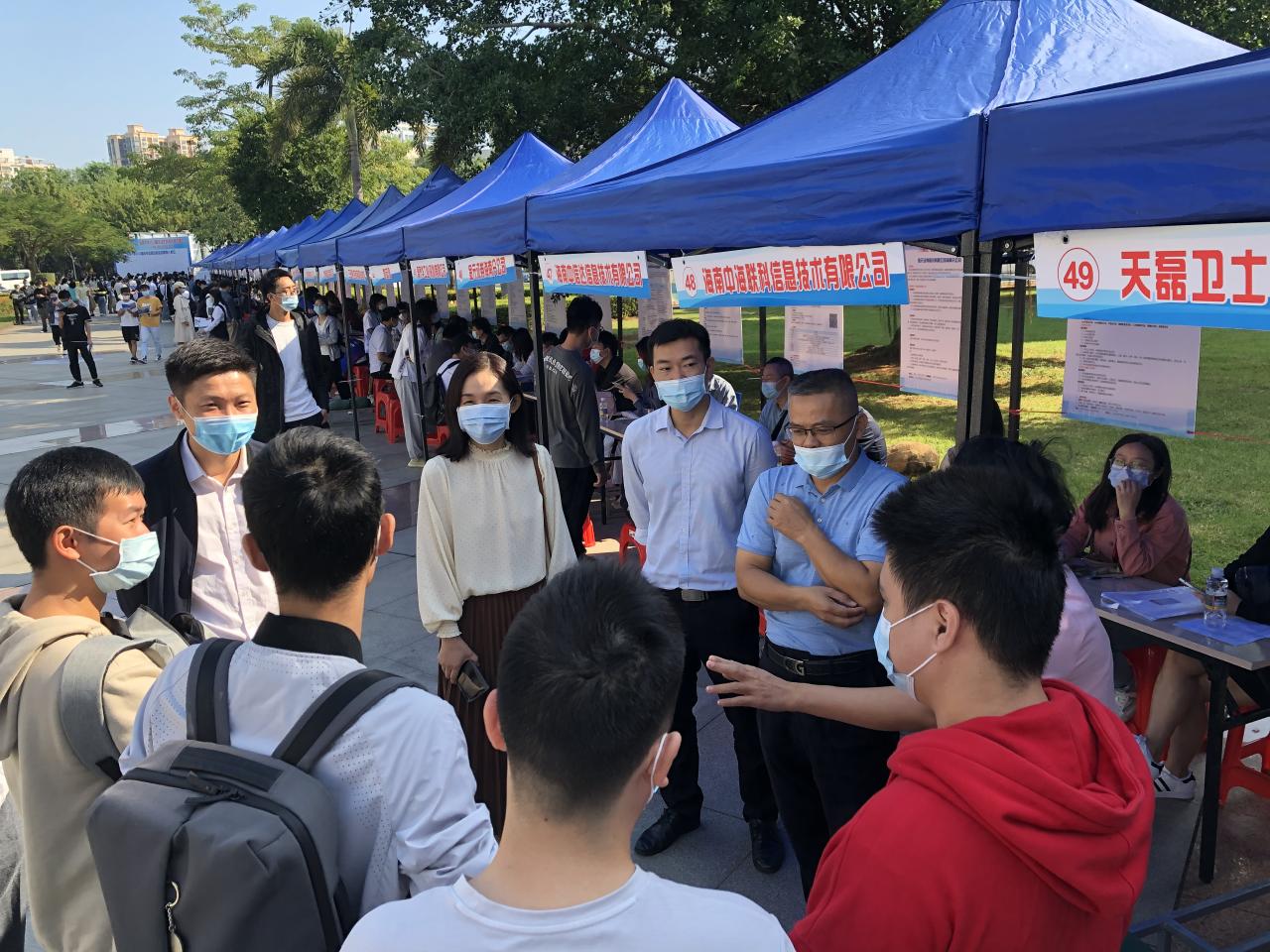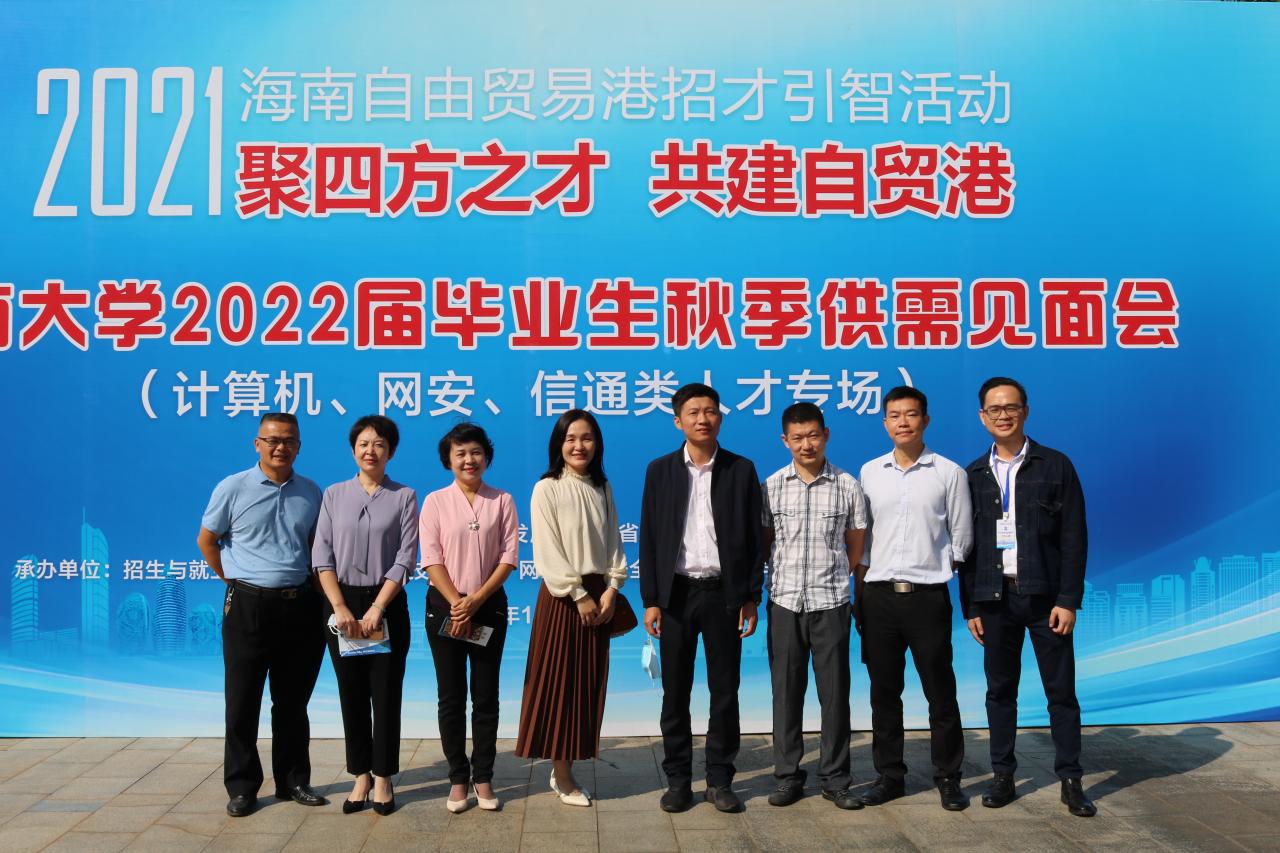 为了进一步搭建用人单位和毕业生供需交流平台,促进学生就业工作,2021年11月14日上午9:00,由海南省人才资源开发局(海南省就业局)与beat365在线唯一官网联合主办,招生就业处、beat365在线唯一官网(密码学院)、计算机科学与技术学院、信息与通信工程学院承办的海南自由贸易港招才引智活动——beat365在线唯一官网2022届毕业生秋季供需见面会(网安、计算机、信通类人才专场)在beat365在线唯一官网三号教学楼前广场举行。三个学院一千余名毕业生参加了双选会。招生与就业处副处长张婷,beat365在线唯一官网(密码学院)党总支书记陈广锐、计算机科学与技术学院院长杨天若、党委副书记(主持学院党委工作)王红英、信息与通信工程学院党委书记蒙秋妍等学院领导来到现场与用人单位和学生交流。