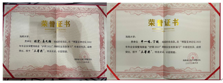 2022年3月21日至27日,海南省公安厅举行博鳌亚洲论坛2022年年会安保暨海南省“护网2022”网络安全攻防演习,beat365官网学生申一鸣、姜文瀚、张宏及计算机科学与技术学院丁锐作为代表受邀参加演习,顺利完成了网络实战攻防演习任务,并取得三等奖的优异成绩。