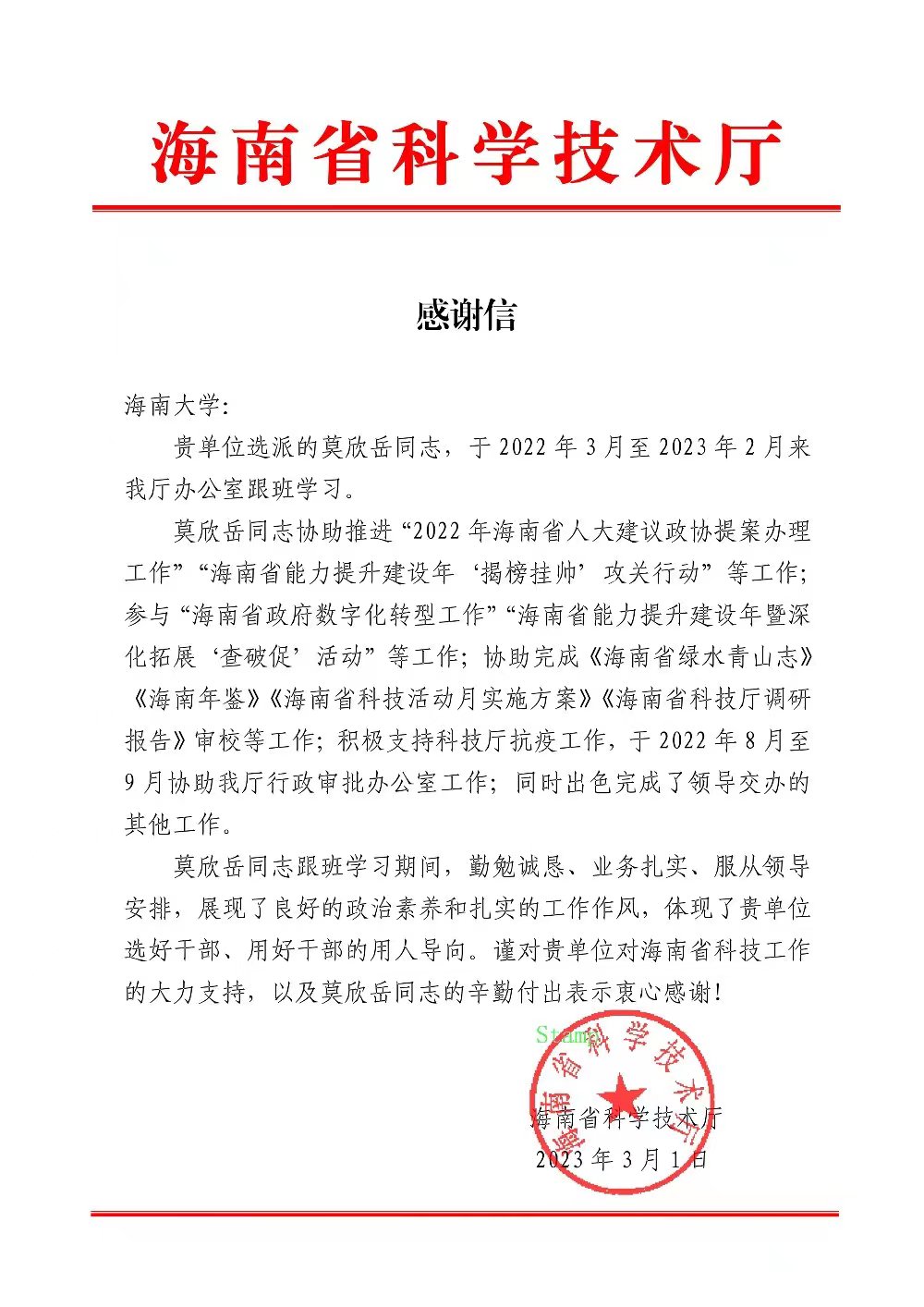 海南省科技厅对beat365官网莫欣岳同志的感谢信