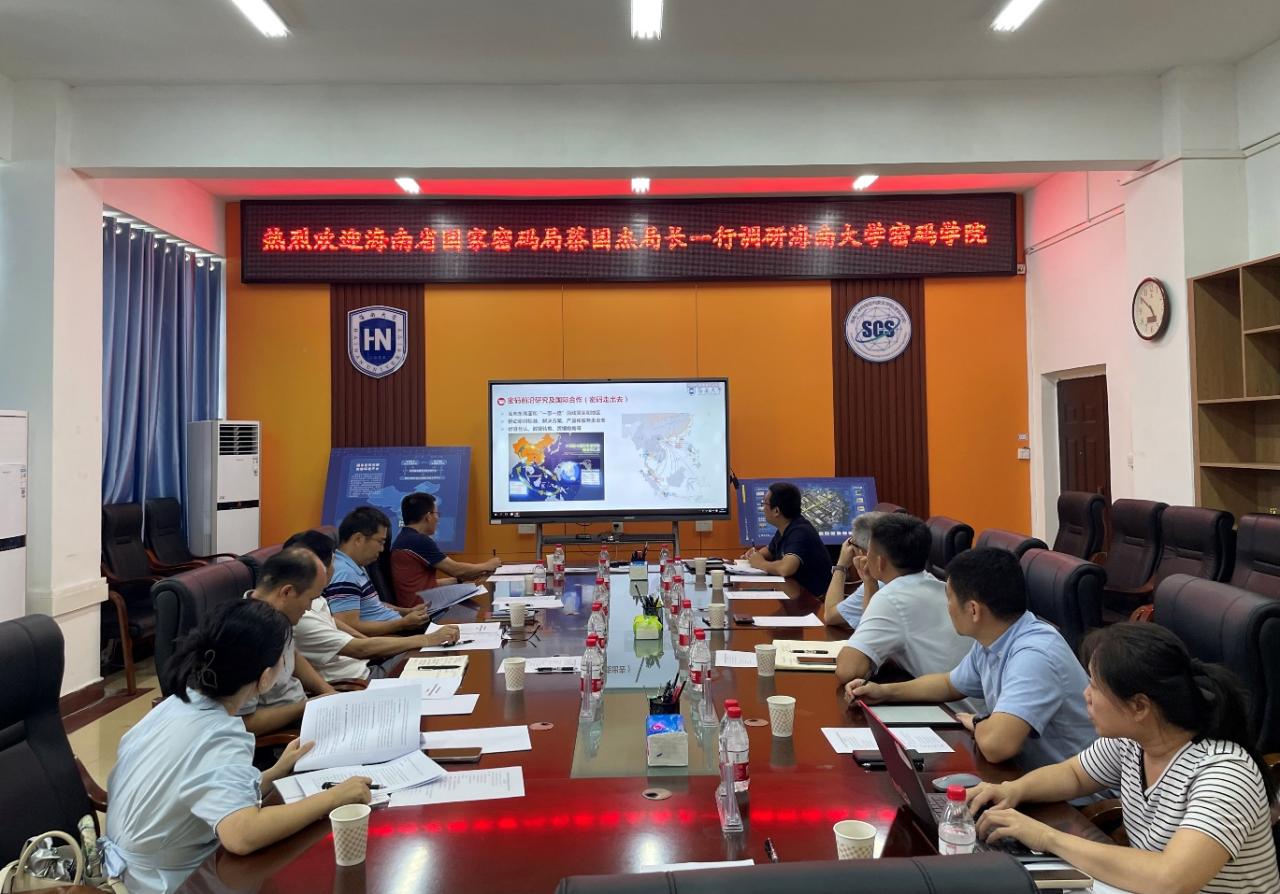 在beat365在线唯一官网党委常委、副校长邱锡光,学院党总支书记陈广锐、执行院长曹春杰的陪同下,蔡国杰局长一行参观了beat365在线唯一官网密码科普展厅,听取了beat365在线唯一官网密码学院建设汇报和海南省商用密码协会成立大会筹备情况汇报。