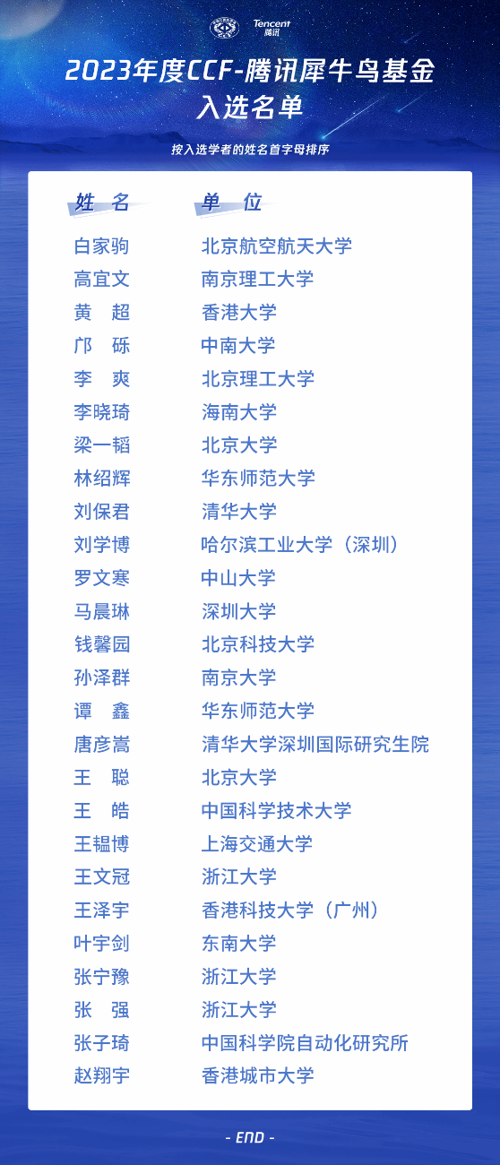 近日,2023年度CCF-腾讯犀牛鸟基金入选学者名单公布,beat365官网李晓琦副教授成功入选。CCF-腾讯犀牛鸟基金是2013年由腾讯公司和中国计算机学会(CCF)共同发起,致力于为海内外青年学者搭建产学合作创新的平台,推动科技在产业创新和社会发展中持续发挥价值。此次共有来自近90所高校的230余份申请,经过基金评审专家函评、会评评审,从申报学者科研能力、研究价值、学术创新性、方案可实施性等方面最终确定26位学者获得本年度基金资助,名单如下(引自CCF官网)。