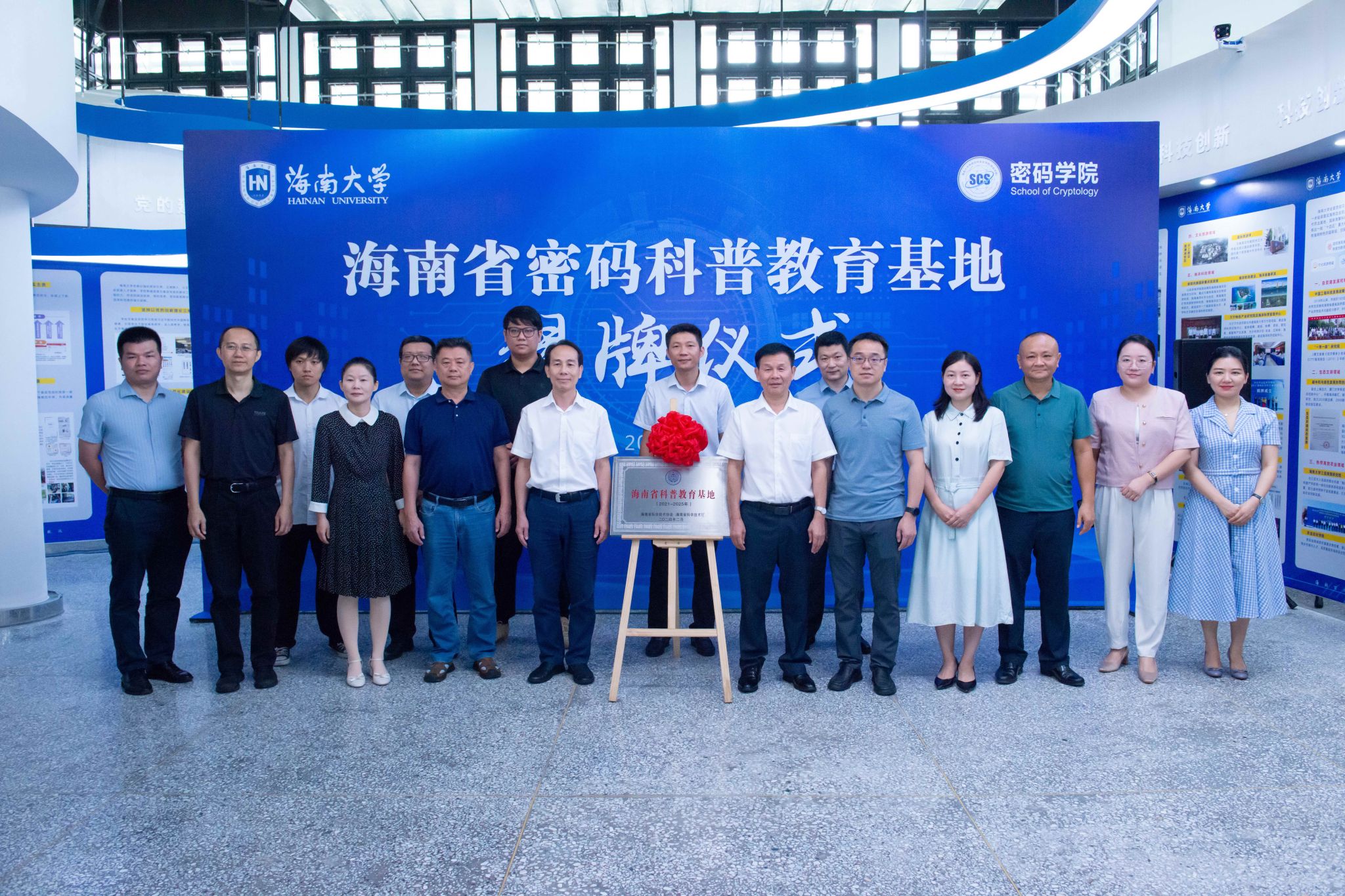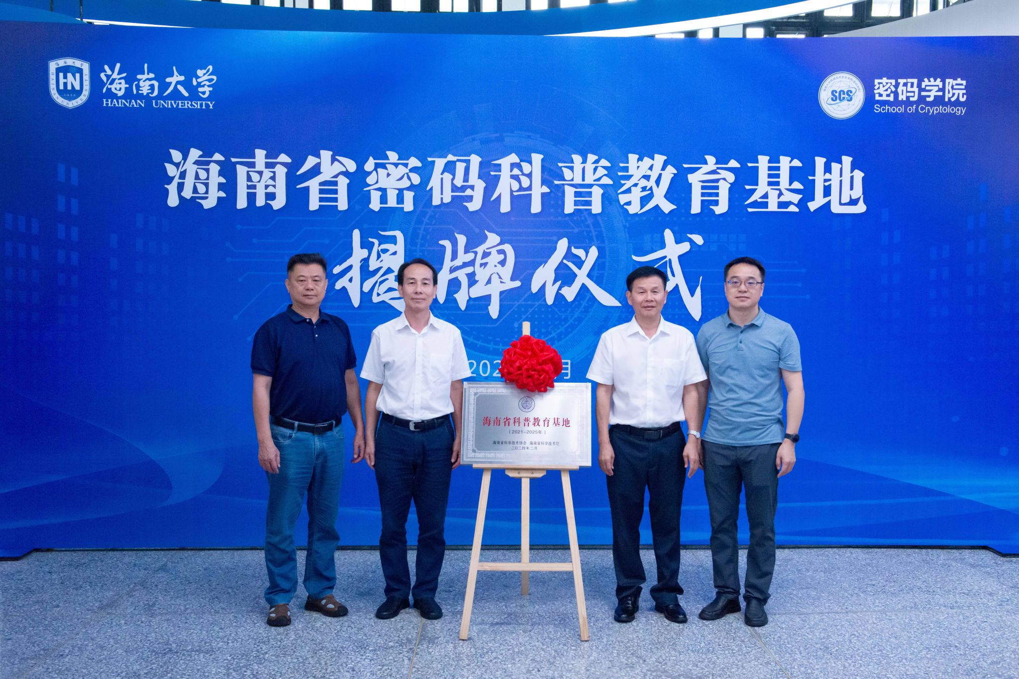 揭牌仪式上,海南省国家密码管理局局长蔡国杰,海南省科学技术协会二级巡视员吴钟海,海南省科学技术厅政策法规规划处副处长覃业敏,beat365在线唯一官网党委常委、副校长刘谦共同为海南省密码科普教育基地揭牌。