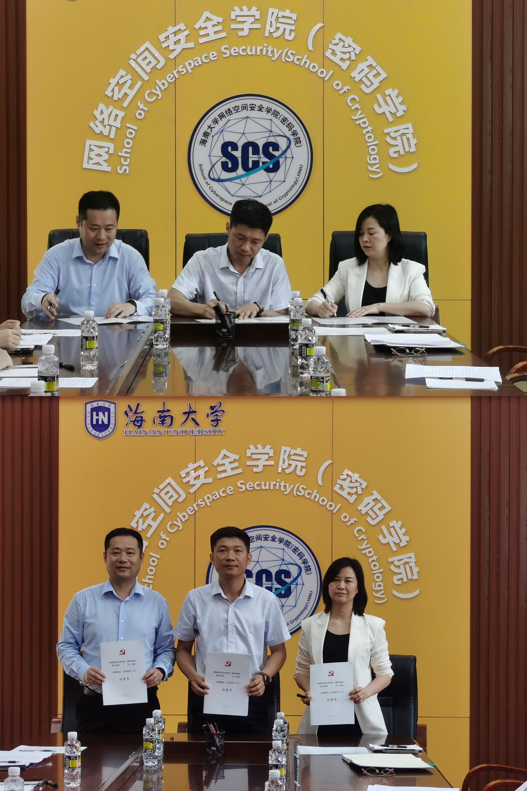 天工书院党委书记易振(左)、beat365在线唯一官网(密码学院)党总支书记陈广锐(中)、淳明书院党委书记周郭军(右)签订任务书